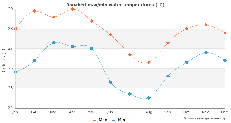 The graph below shows the range of monthly Bonabéri water temperature derived from many years of historical sea surface temperature data.