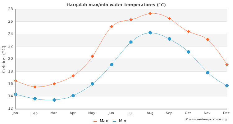 The measurements for the water temperature in Harqalah are provided by the daily satellite readings provided by the NOAA. The temperatures given are the sea surface temperature (SST) which is most relevant to recreational users.