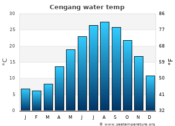 The measurements for the water temperature in Cengang, Zhejiang Sheng are provided by the daily satellite readings provided by the NOAA. The temperatures given are the sea surface temperature (SST) which is most relevant to recreational users.