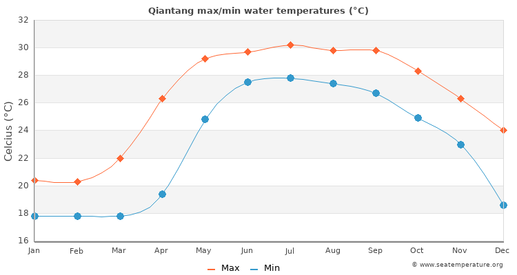 The graph below shows the range of monthly Qiantang water temperature derived from many years of historical sea surface temperature data.