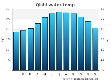 The measurements for the water temperature in Qishi, Guangdong Province are provided by the daily satellite readings provided by the NOAA. The temperatures given are the sea surface temperature (SST) which is most relevant to recreational users.