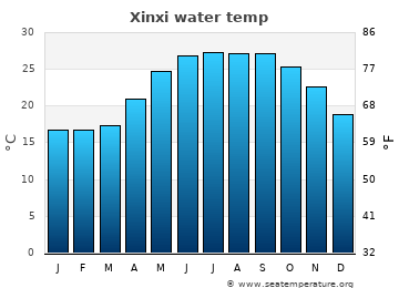 The measurements for the water temperature in Xinxi, Guangdong Province are provided by the daily satellite readings provided by the NOAA. The temperatures given are the sea surface temperature (SST) which is most relevant to recreational users.