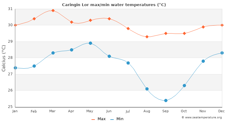 The graph below shows the range of monthly Caringin Lor water temperature derived from many years of historical sea surface temperature data.