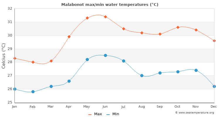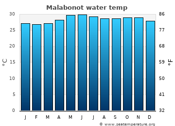 The measurements for the water temperature in Malabonot, Western Visayas are provided by the daily satellite readings provided by the NOAA. The temperatures given are the sea surface temperature (SST) which is most relevant to recreational users.