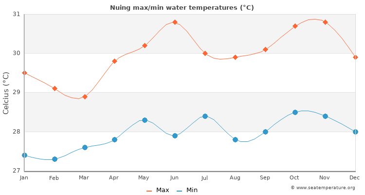 The graph below shows the range of monthly Nuing water temperature derived from many years of historical sea surface temperature data.