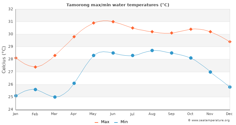 The measurements for the water temperature in Tamorong, Ilocos are provided by the daily satellite readings provided by the NOAA. The temperatures given are the sea surface temperature (SST) which is most relevant to recreational users.