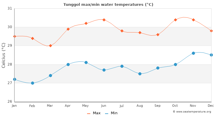 The measurements for the water temperature in Tunggol, Autonomous Region in Muslim Mindanao are provided by the daily satellite readings provided by the NOAA. The temperatures given are the sea surface temperature (SST) which is most relevant to recreational users.