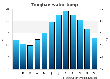 The graph below shows the range of monthly Tonghae water temperature derived from many years of historical sea surface temperature data.