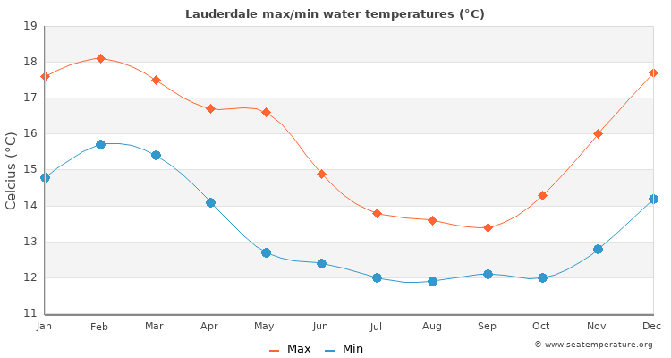 The graph below shows the range of monthly Lauderdale water temperature derived from many years of historical sea surface temperature data.