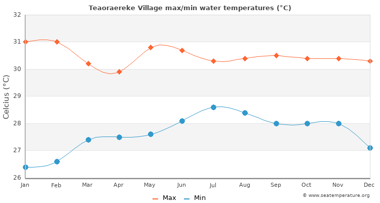 The graph below shows the range of monthly Teaoraereke Village water temperature derived from many years of historical sea surface temperature data.