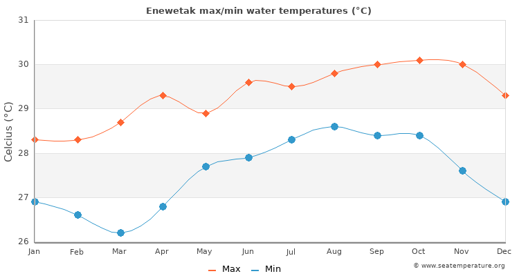The measurements for the water temperature in Enewetak, Enewetak Atoll are provided by the daily satellite readings provided by the NOAA. The temperatures given are the sea surface temperature (SST) which is most relevant to recreational users.