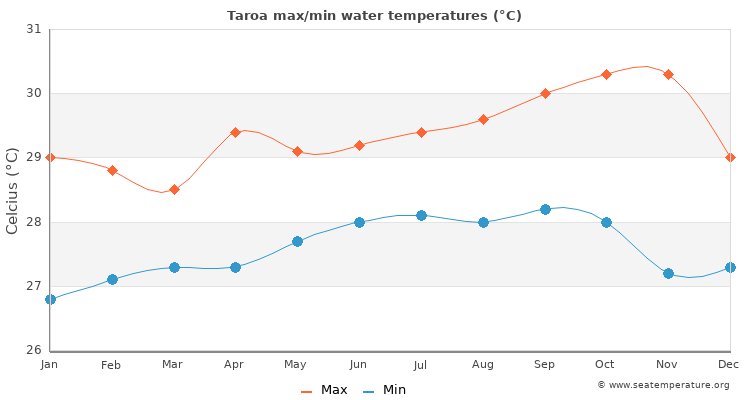 The graph below shows the range of monthly Taroa water temperature derived from many years of historical sea surface temperature data.