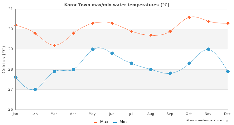 The measurements for the water temperature in Koror Town, Koror are provided by the daily satellite readings provided by the NOAA. The temperatures given are the sea surface temperature (SST) which is most relevant to recreational users.