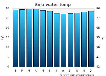 The measurements for the water temperature in Sola, Torba are provided by the daily satellite readings provided by the NOAA. The temperatures given are the sea surface temperature (SST) which is most relevant to recreational users.
