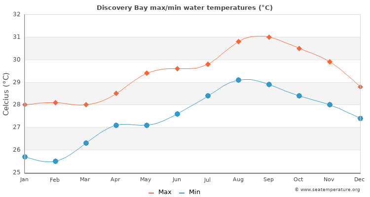 The measurements for the water temperature in Discovery Bay, Saint Ann are provided by the daily satellite readings provided by the NOAA. The temperatures given are the sea surface temperature (SST) which is most relevant to recreational users.