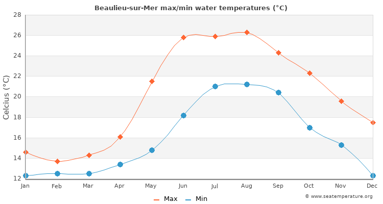 The graph below shows the range of monthly Beaulieu-sur-Mer water temperature derived from many years of historical sea surface temperature data.