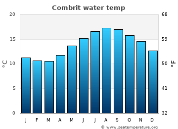 The graph below shows the range of monthly Combrit water temperature derived from many years of historical sea surface temperature data.