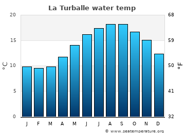 The measurements for the water temperature in La Turballe, Pays de la Loire are provided by the daily satellite readings provided by the NOAA. The temperatures given are the sea surface temperature (SST) which is most relevant to recreational users.