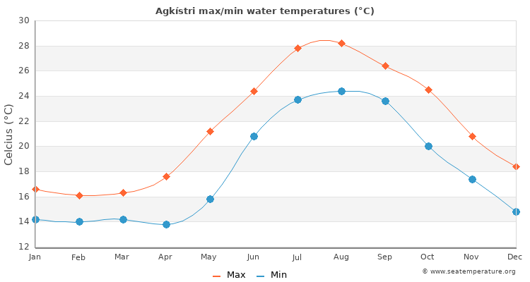 The graph below shows the range of monthly Agkístri water temperature derived from many years of historical sea surface temperature data.
