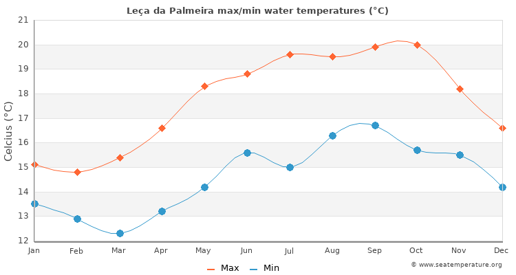 The graph below shows the range of monthly Leça da Palmeira water temperature derived from many years of historical sea surface temperature data.