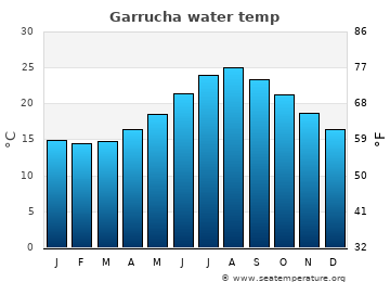 The warmest water temperature is in August with an average around 77.2°F / 25.1°C. The coldest month is February with an average water temperature of 58.1°F / 14.5°C.