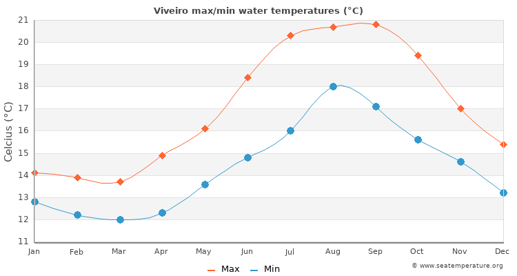 The graph below shows the range of monthly Viveiro water temperature derived from many years of historical sea surface temperature data.