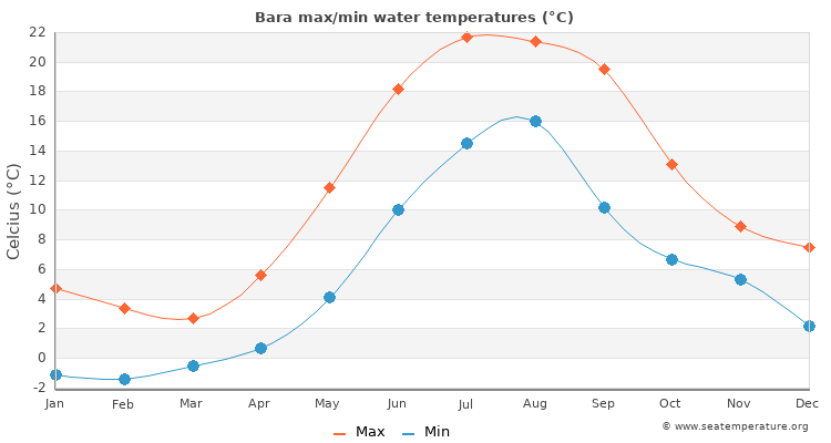 The graph below shows the range of monthly Bara water temperature derived from many years of historical sea surface temperature data.