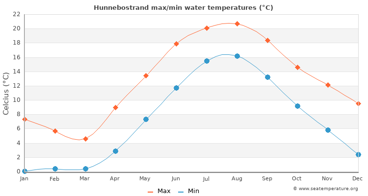 The measurements for the water temperature in Hunnebostrand, Västra Götaland are provided by the daily satellite readings provided by the NOAA. The temperatures given are the sea surface temperature (SST) which is most relevant to recreational users.