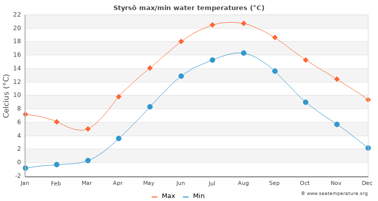 The measurements for the water temperature in Styrsö, Västra Götaland are provided by the daily satellite readings provided by the NOAA. The temperatures given are the sea surface temperature (SST) which is most relevant to recreational users.