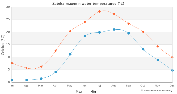 The graph below shows the range of monthly Zatoka water temperature derived from many years of historical sea surface temperature data.