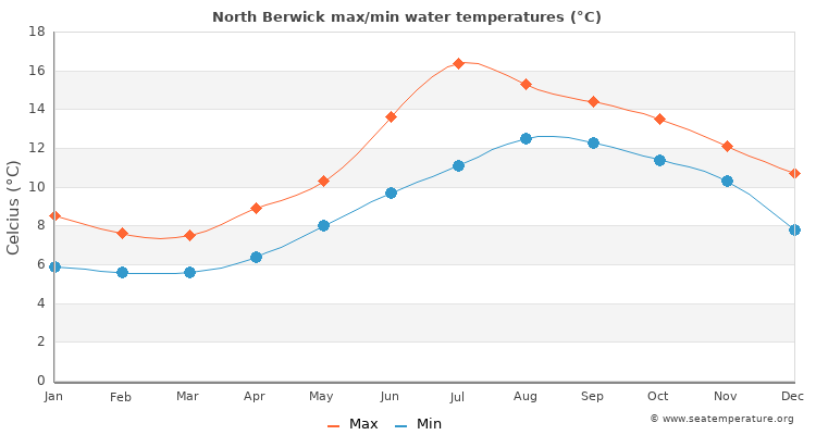 The measurements for the water temperature in North Berwick, Scotland are provided by the daily satellite readings provided by the NOAA. The temperatures given are the sea surface temperature (SST) which is most relevant to recreational users.