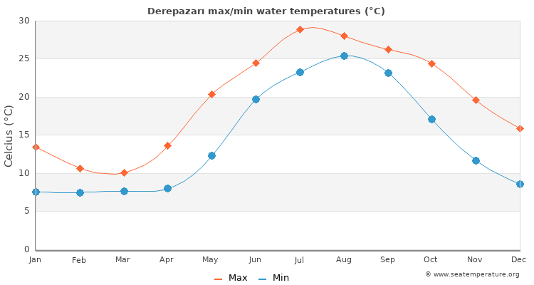 The graph below shows the range of monthly Derepazarı water temperature derived from many years of historical sea surface temperature data.