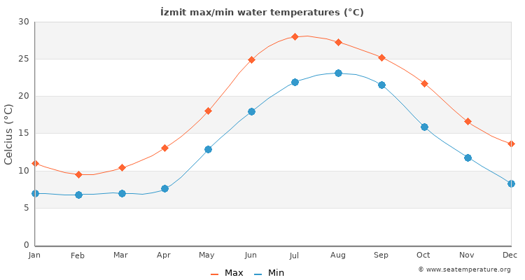 The graph below shows the range of monthly İzmit water temperature derived from many years of historical sea surface temperature data.