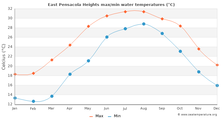 The measurements for the water temperature in East Pensacola Heights, Florida are provided by the daily satellite readings provided by the NOAA. The temperatures given are the sea surface temperature (SST) which is most relevant to recreational users.