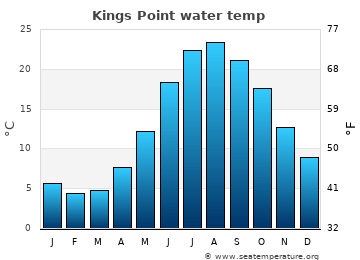 The measurements for the water temperature in Kings Point, New York are provided by the daily satellite readings provided by the NOAA. The temperatures given are the sea surface temperature (SST) which is most relevant to recreational users.