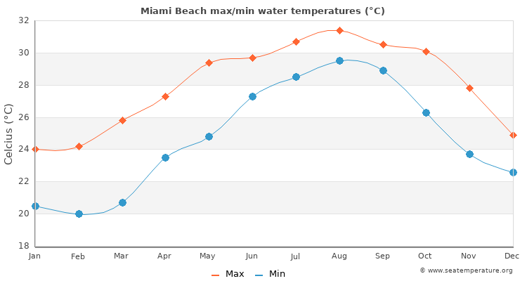 The measurements for the water temperature in Miami Beach, Florida are provided by the daily satellite readings provided by the NOAA. The temperatures given are the sea surface temperature (SST) which is most relevant to recreational users.