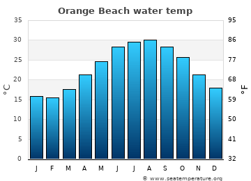 The measurements for the water temperature in Orange Beach, Alabama are provided by the daily satellite readings provided by the NOAA. The temperatures given are the sea surface temperature (SST) which is most relevant to recreational users.