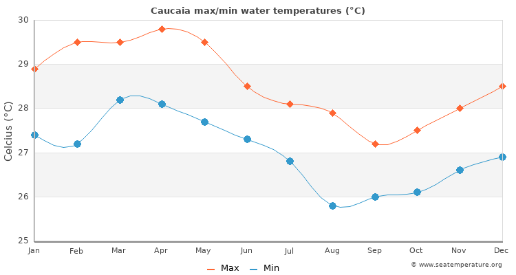 The measurements for the water temperature in Caucaia, CearĂ¡ are provided by the daily satellite readings provided by the NOAA. The temperatures given are the sea surface temperature (SST) which is most relevant to recreational users.